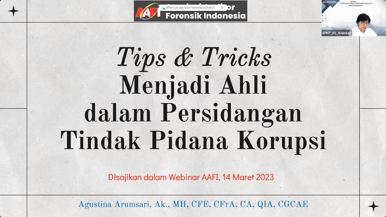 Terkait hal itu, AAFI ABUA menggelar webinar bertajuk Tips and Tricks Menjadi Ahli di Persidangan yang menghadirkan Ibu Agustina Arumsari, Ak., M.H., CFE, CFrA, CA, QIA, CGCAE (Deputi Investigasi BPKP) sebagai Narasumber dan Ibu Dr. Selvia Vivi Devianti S.E., M.Sc., MCP., Ak, CFrA, CFE, CSFA (Direktur Litbang BPK RI) selaku Moderator.�