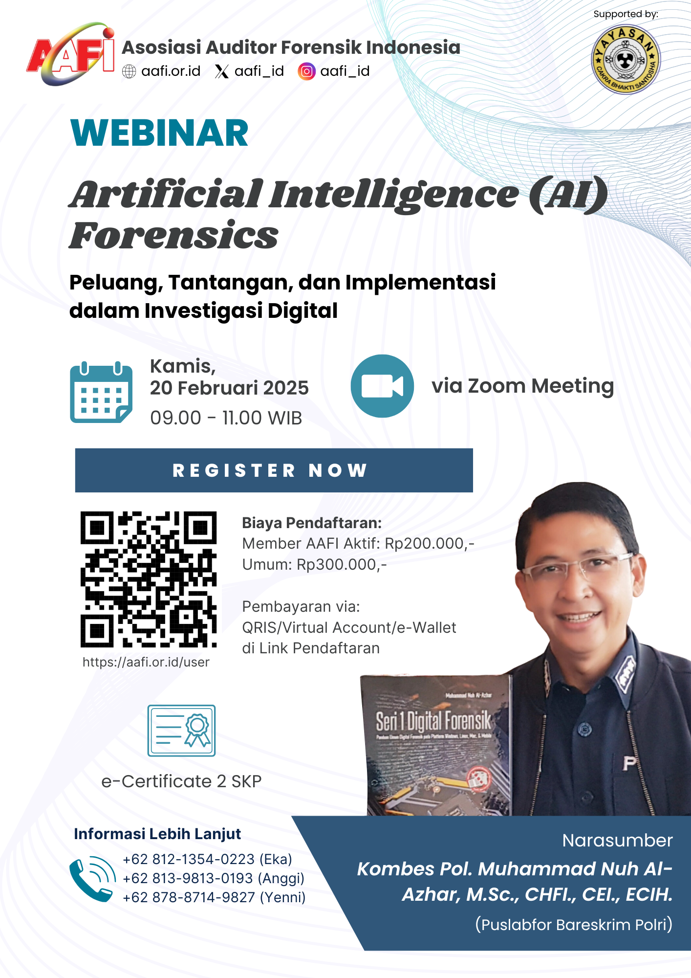 Untuk menjawab pertanyaan-pertanyaan ini, Asosiasi Auditor Forensik Indonesia Abua (AAFI ABUA), dengan dukungan dari Yayasan Cakra Bhakti Santosha, mengadakan webinar bertema "Artificial Intelligence (AI) Forensics".