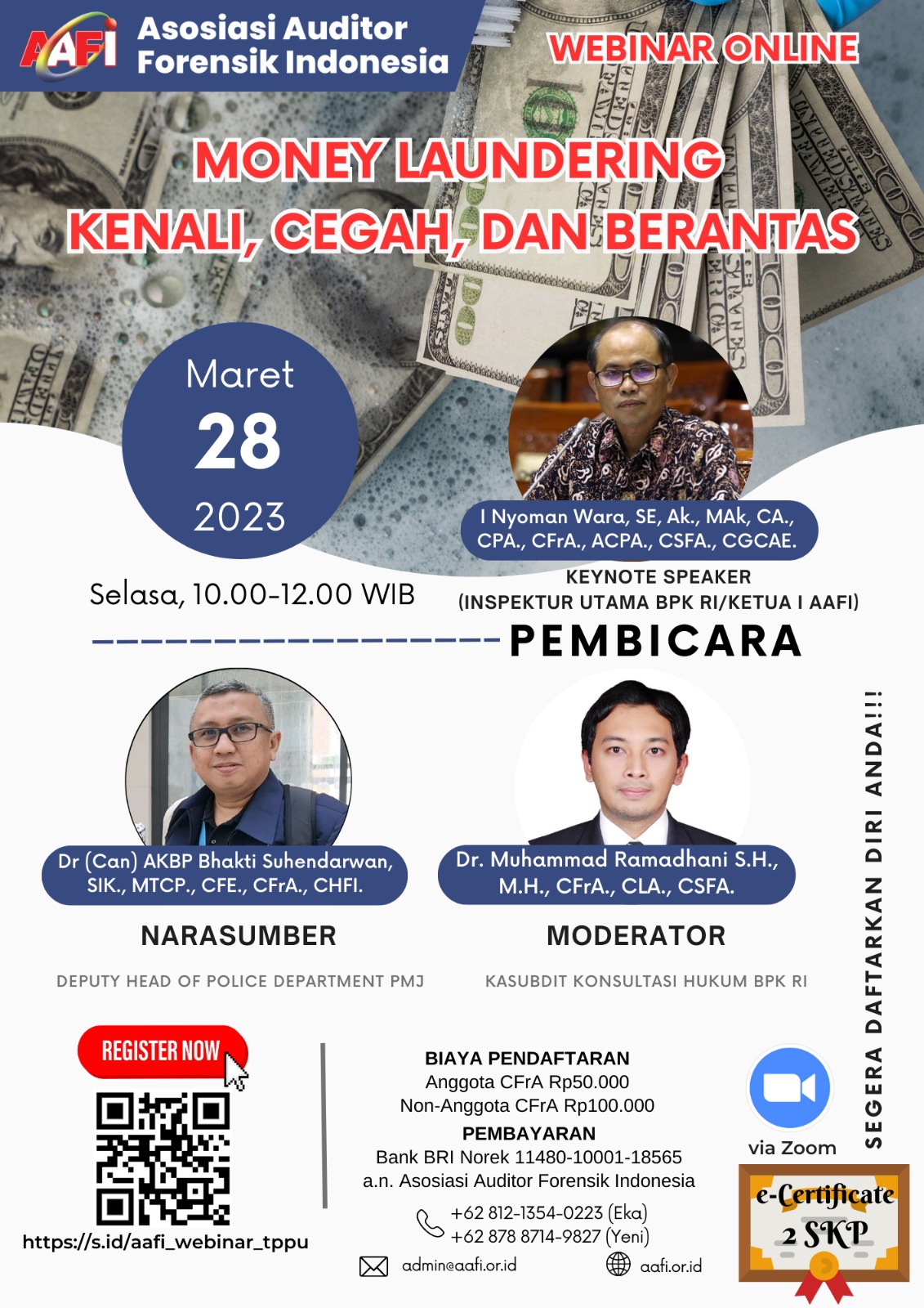 Asosiasi Forensik Auditor Indonesia (AAFI ABUA) mengundang Bapak/Ibu dalam Webinar Online dengan Tema MONEY LAUNDERING, KENALI, CEGAH, DAN BERANTAS