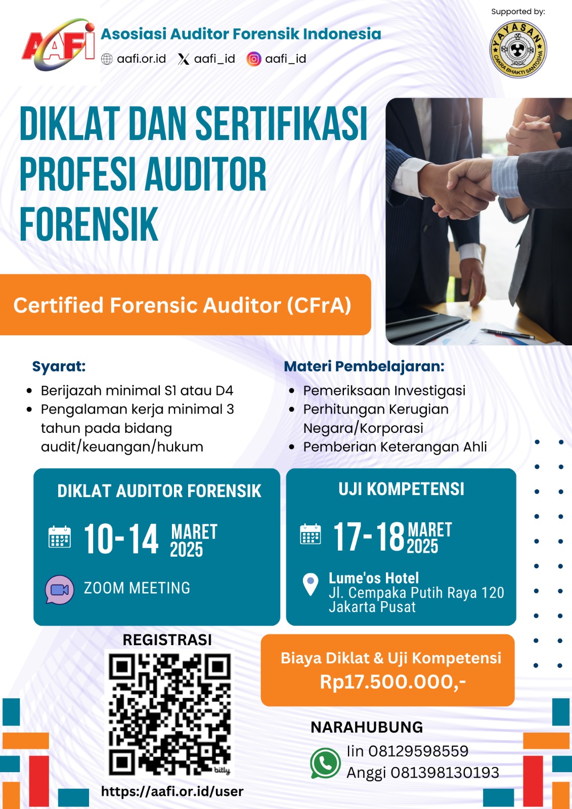 Asosiasi Auditor Forensik Indonesia Abua (AAFI ABUA), dengan dukungan dari Yayasan Cakra Bhakti Santosha, kembali mengadakan Diklat dan Sertifikasi Profesi Auditor Forensik dengan gelar Certified Forensic Auditor (CFrA). Program ini bertujuan untuk meningkatkan kompetensi para auditor dalam bidang audit investigatif dan forensik guna mendukung upaya pemberantasan tindak pidana keuangan dan korupsi.